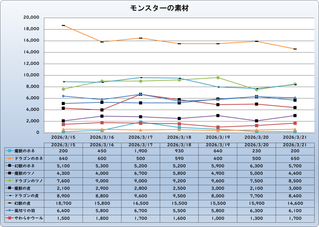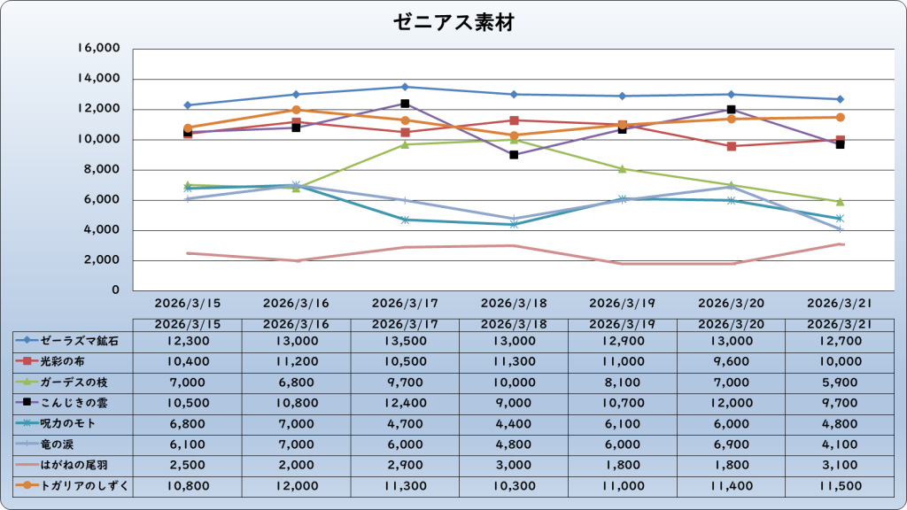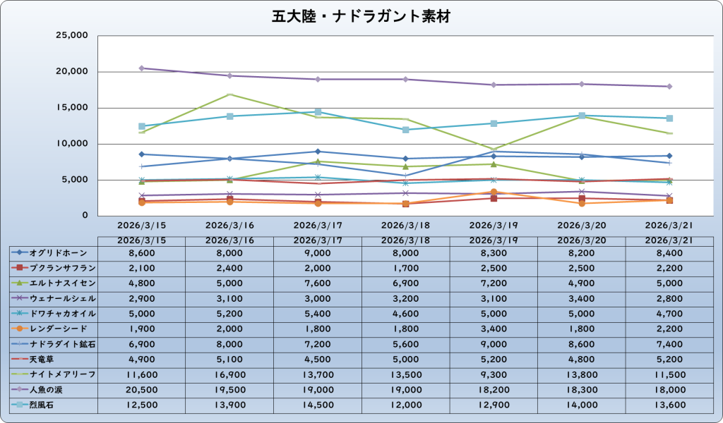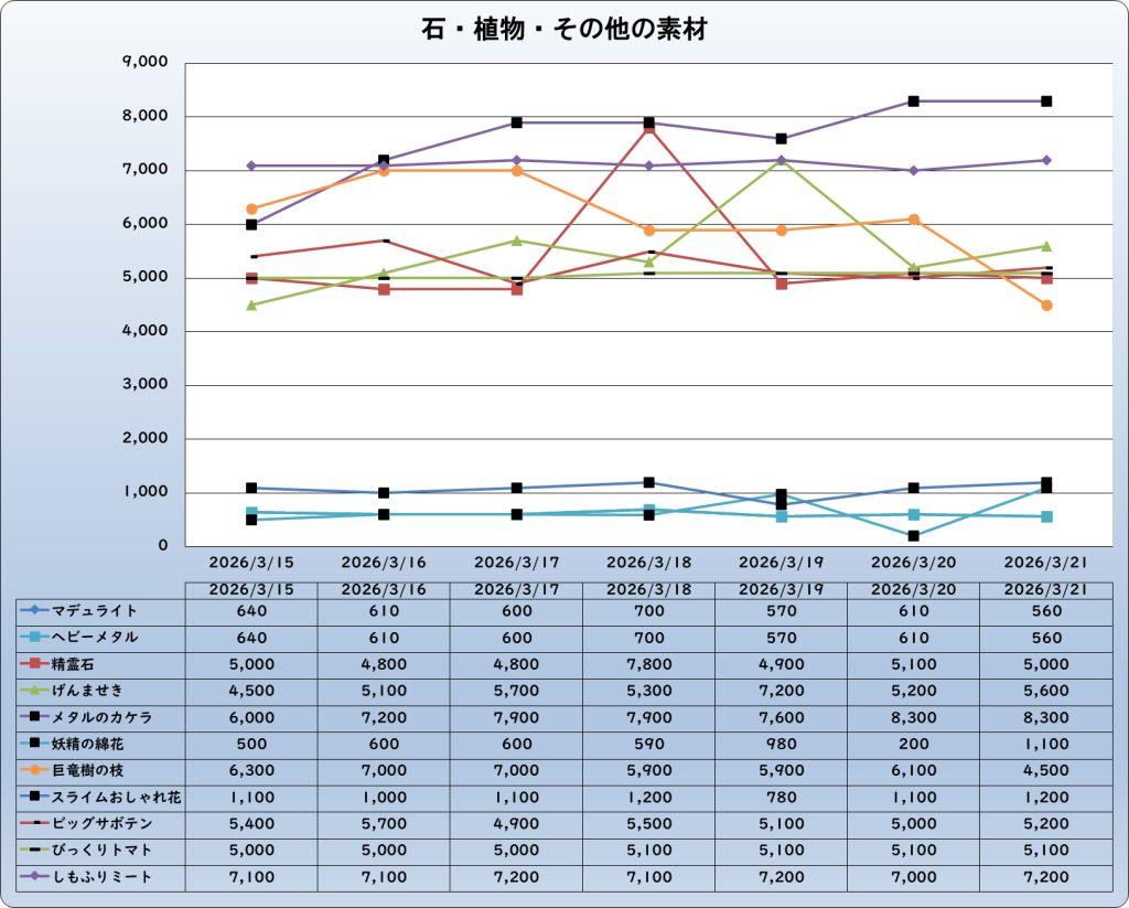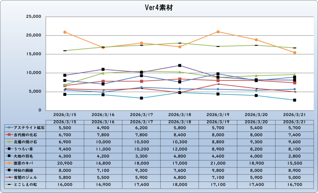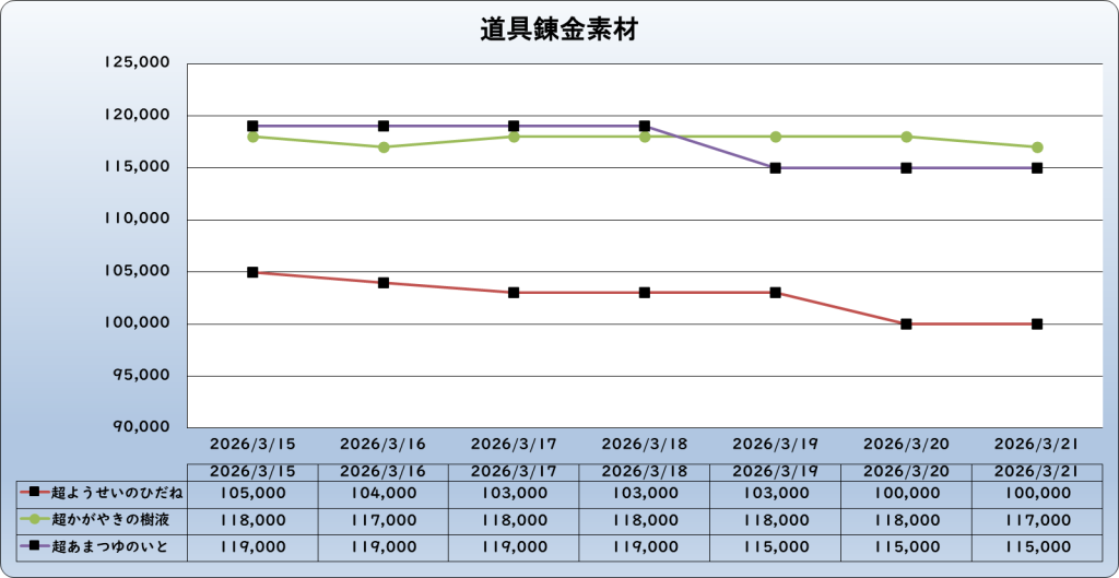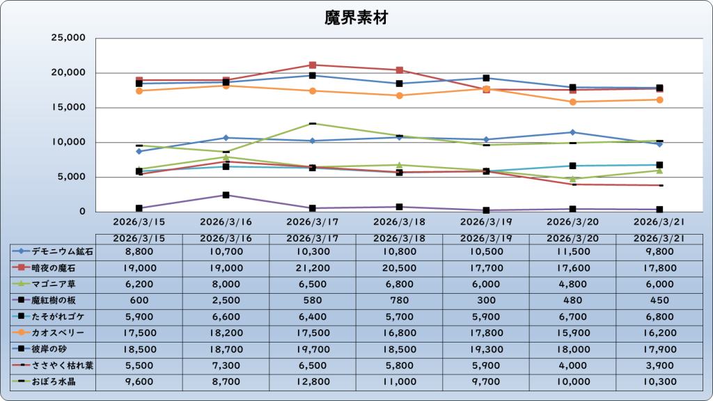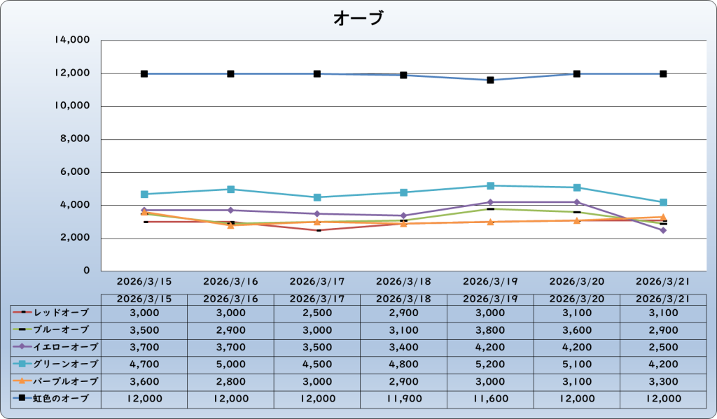 それでは、2026年3月21日までの1週間分のバザー相場の動きを載せています。