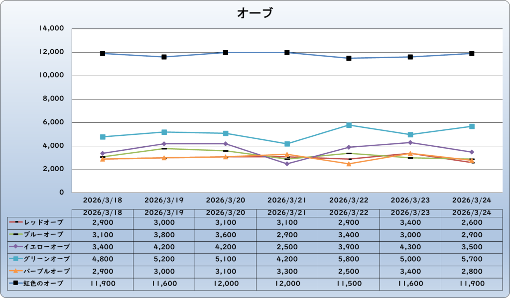 | 虹色のオーブ | 11,900 | -100 | -0.8% | 12,000 |