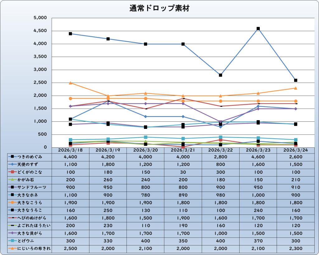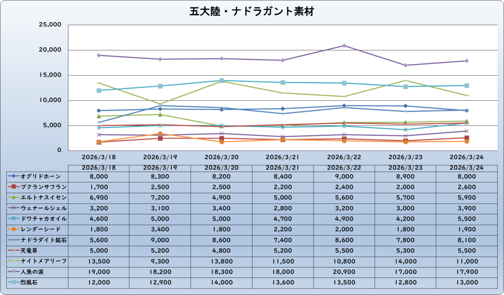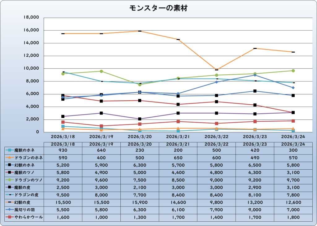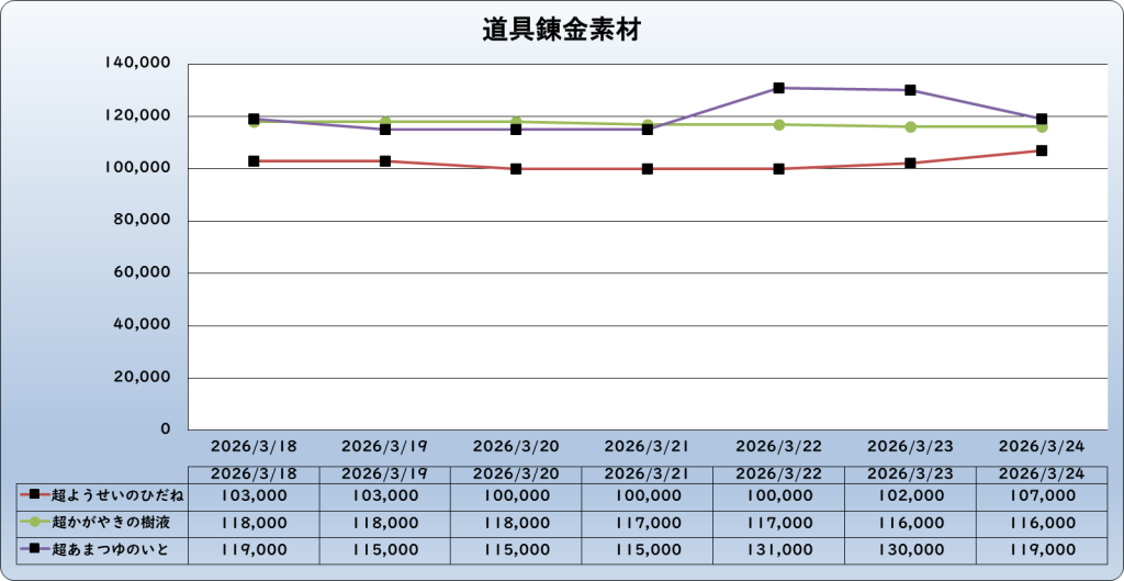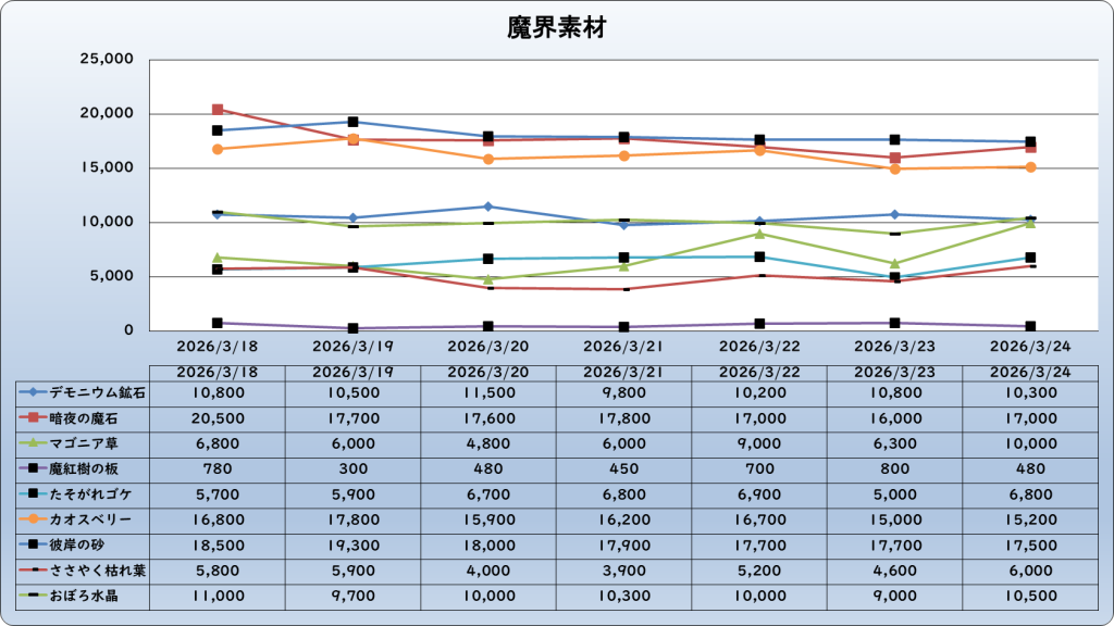 それでは、2026年3月24日までの1週間分のバザー相場の動きを載せています。