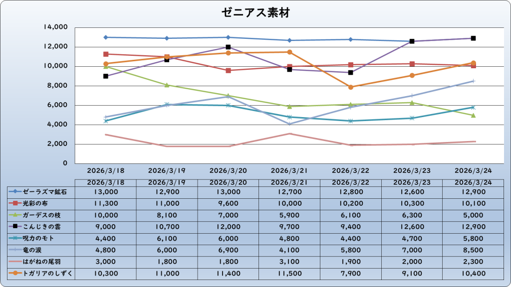 | ゼーラズマ鉱石 | 12,900 | -600 | -4.4% | 13,500 |